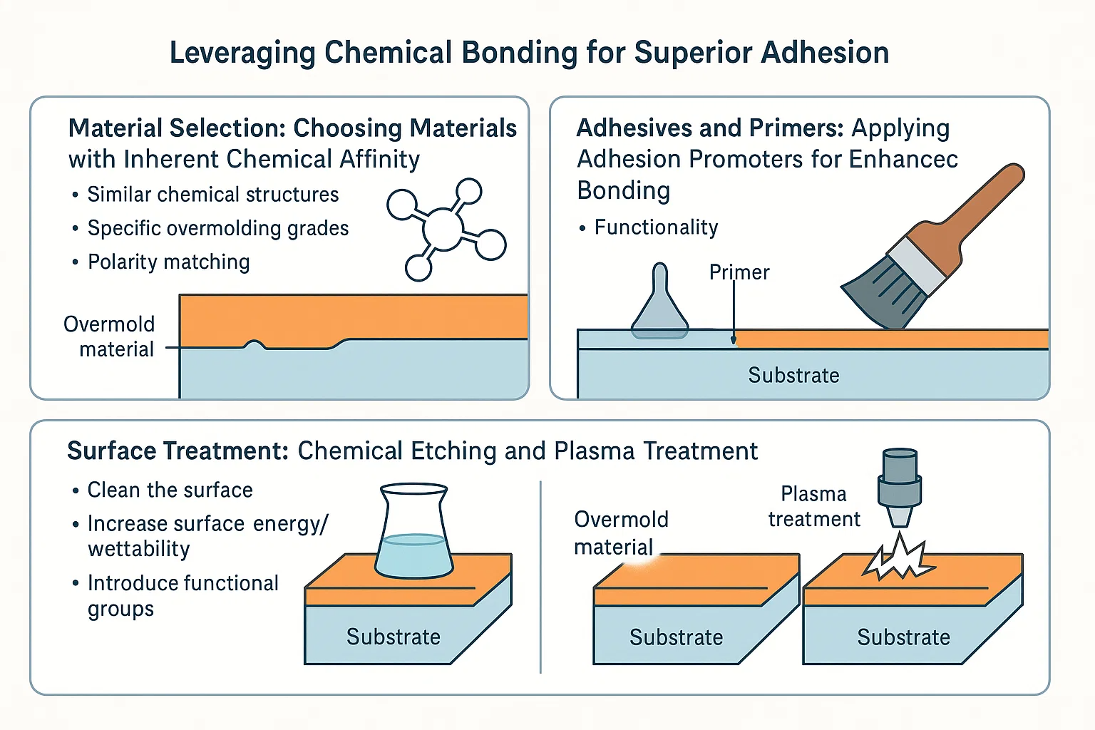 화학적으로 호환되는 재료를 사용하더라도 표면 오염 물질 또는 낮은 표면 에너지는 결합을 방해 할 수 있습니다. 다양한 표면 처리는 기질이 화학적 상호 작용을보다 수용 할 수 있도록 준비 할 수 있습니다.