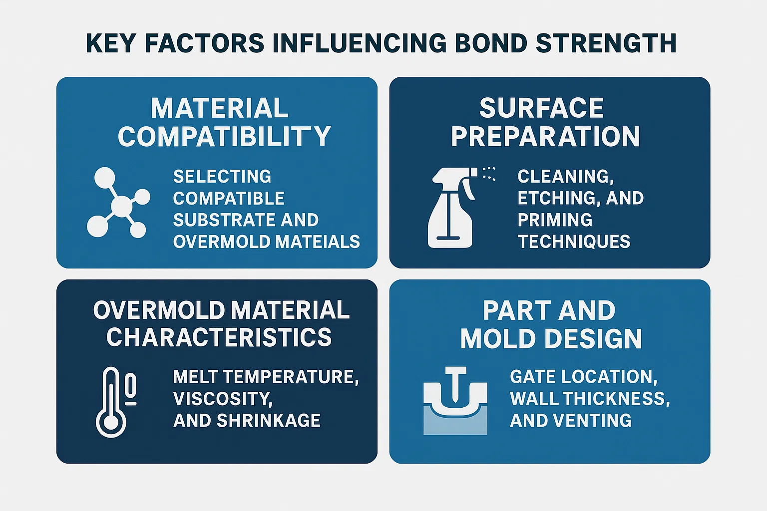 오버 모딩에서 우수한 유대를 달성하는 것은 과학을 이해하는 것이 아닙니다. 설계 및 제조 공정 전반에 걸쳐 몇 가지 실용적인 요인을 세 심하게 제어하는 것입니다. 이 중 하나를 무시하면 최종 결합 강도가 크게 손상 될 수 있습니다.