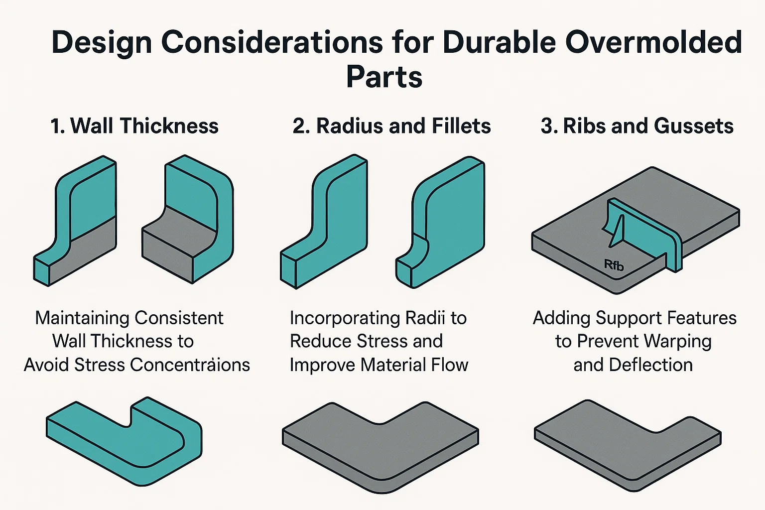 벽 두께 : 유지 일관된 벽 두께 오버 몰드 재료에서 균일 한 냉각 및 수축을 보장하여 내부 응력을 최소화합니다. 벽 두께의 급격한 변화는 차동 냉각, 뒤틀림 및 약화 된 결합으로 이어질 수 있습니다.