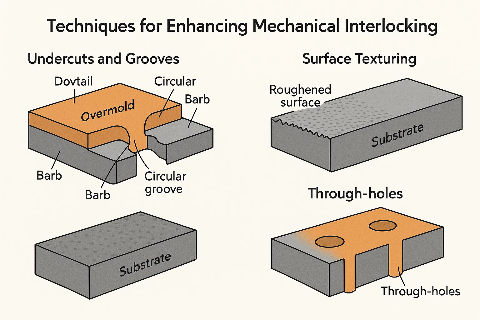 언더컷과 그루브를 기판 내의 미세한 후크 또는 앵커로 생각하십시오. 녹은 오버 몰드 재료가 이러한 특징으로 흐르고 냉각되면 주위를 굳히고 물리적 잠금을 만듭니다.