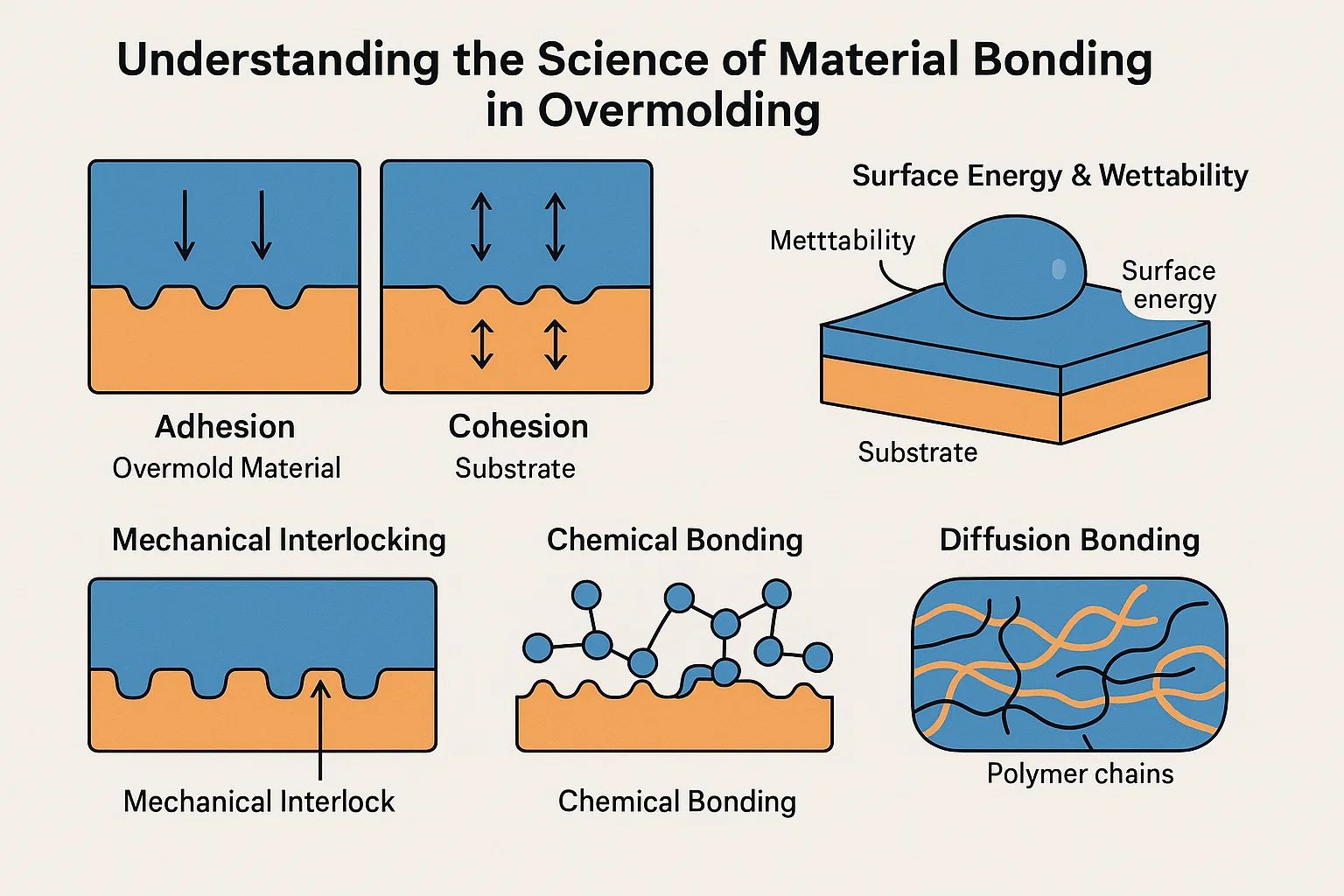 오버 모딩에서 영구적 인 유대를 달성하는 것은 마술이 아닙니다. 재료가 현미경 수준에서 상호 작용하는 방법에 뿌리를 둔 과학입니다. 진정으로 오버 몰화를 마스터하려면 우리는의 기본 원칙을 파악해야합니다. 부착 그리고 응집력 및 기판과 오버 몰드 재료 사이의 인터페이스에 어떻게 적용되는지.
