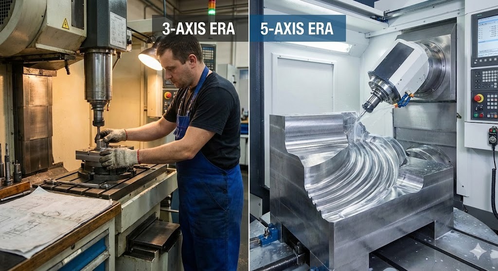 - 3D/3축 시대: 깊이가 도입되었지만 복잡한 세부 사항을 위해서는 "전극"과 EDM(방전 가공)이 필요했습니다.