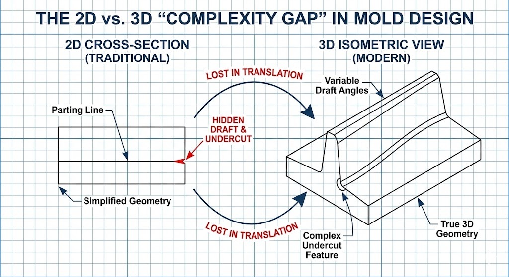 동안 금형 설계 기본이 2D 제도를 기반으로 구축되었지만 "유기적" 및 고성능 제품에 대한 수요가 증가하면서 평면적 사고의 한계가 드러났습니다. 경쟁이 치열한 시장에서 전통적인 2D 중심 워크플로우에 의존하면 혁신을 방해하고 비용을 부풀리는 "복잡성 한도"가 발생합니다.