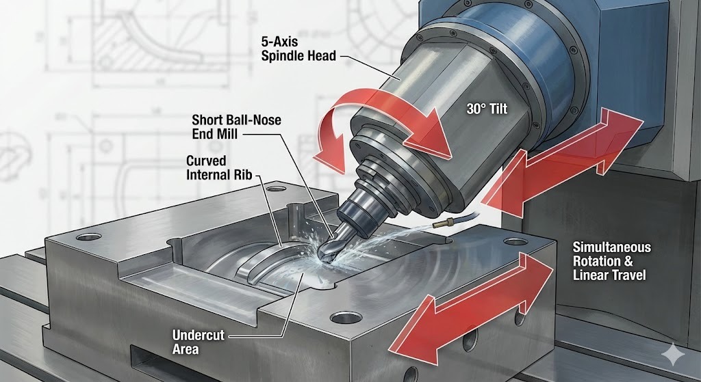 - 언더컷: 수직 도구에서 "숨겨진" 금형의 오목한 영역입니다. 5축 틸팅을 통해 도구가 이러한 선반 "아래로 도달"할 수 있습니다.