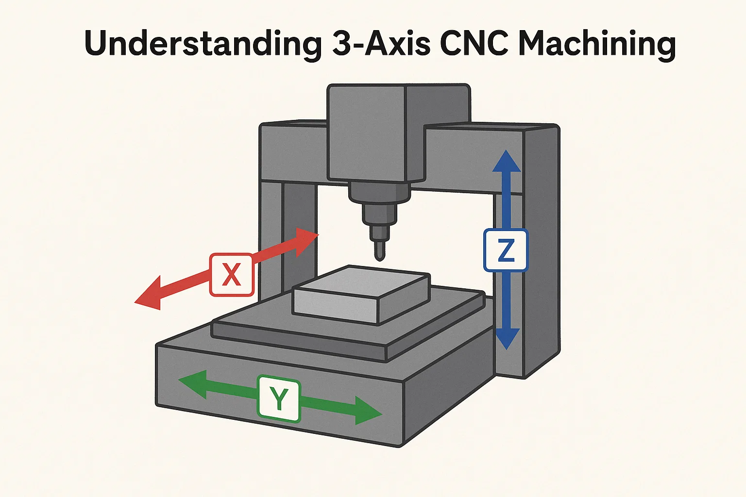 3 축 CNC 기계는 세 가지 선형 경로 (X, Y, Z)를 따라 절단 도구를 이동하여 단순하고 평평한 부품 및 기본 기능에 이상적입니다.