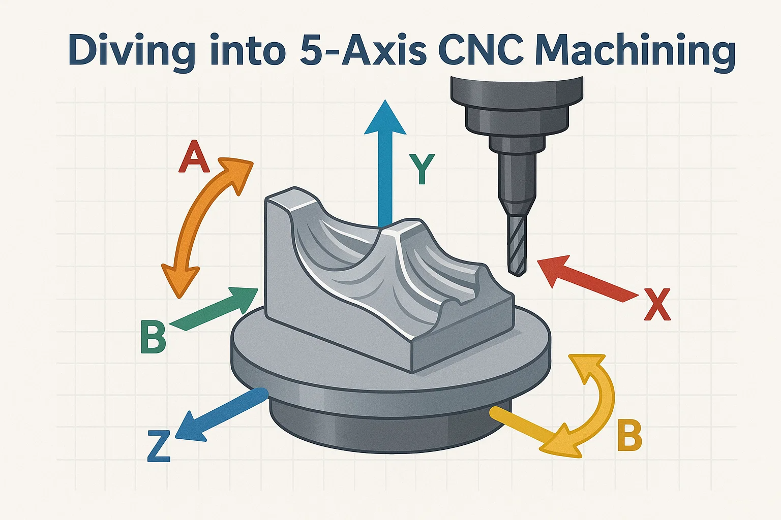 5 축 기계에는 여전히 친숙한 선형이 있습니다. x, y 및 z 축. 추가 두 축은 회전이며 일반적으로 A와 B, 또는 A 및 C. .